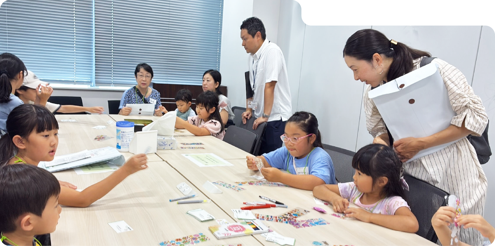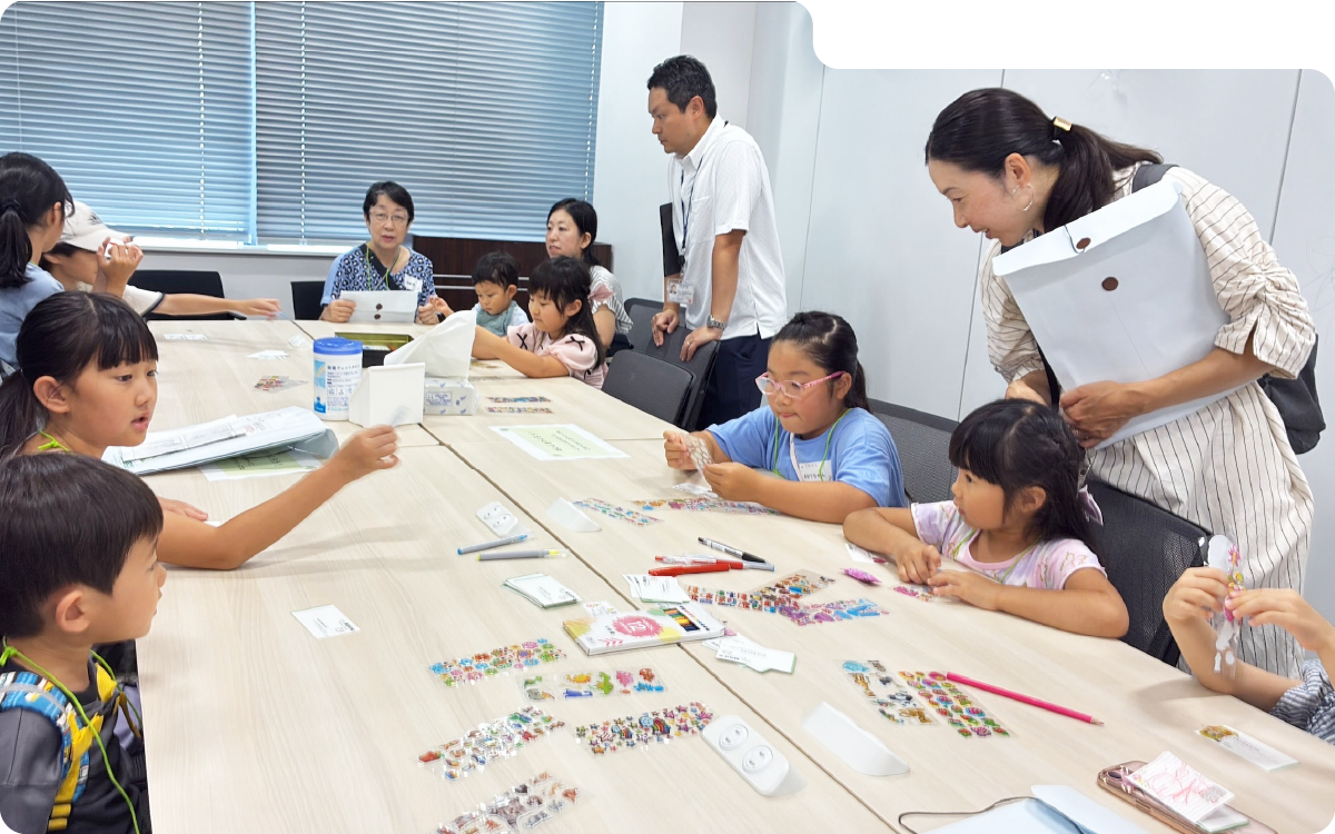 さまざまなシールや色とりどりのカラーペンを使って、世界に一枚だけの名刺を完成させました。